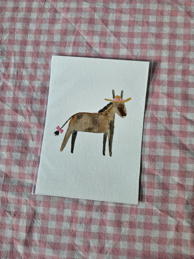 Illustration originale à l'aquarelle d'un petit âne avec un joli chapeau de paille