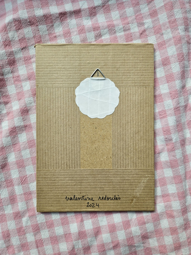 Encadré à la main sous verre, bordure kraft. Attache à l'arrière.