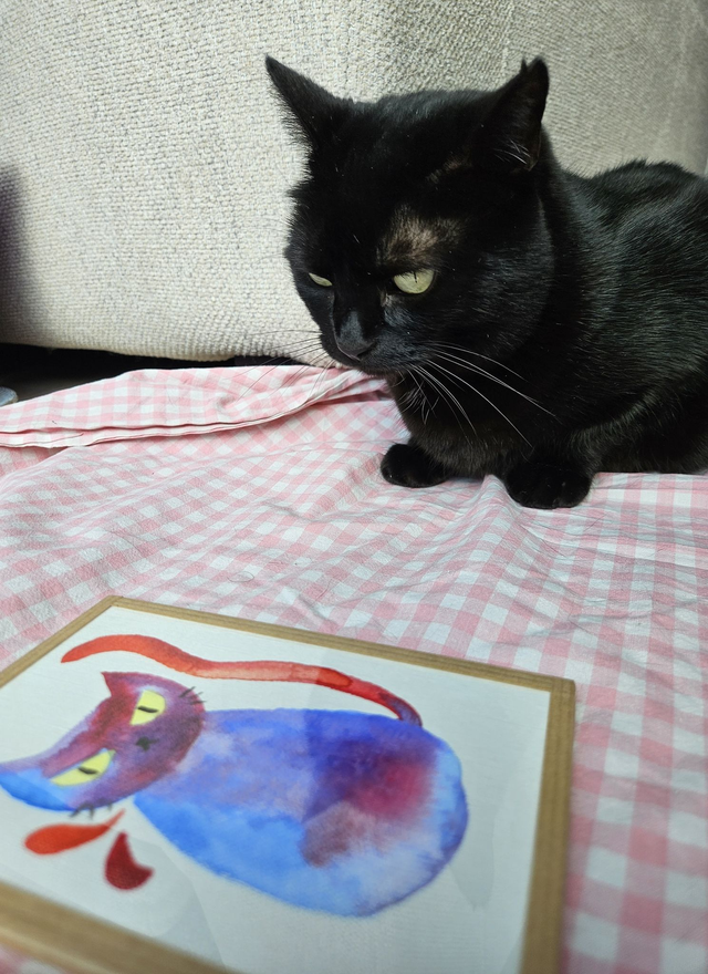 Illustration originale unique à l'aquarelle d'un chat pas content très coloré